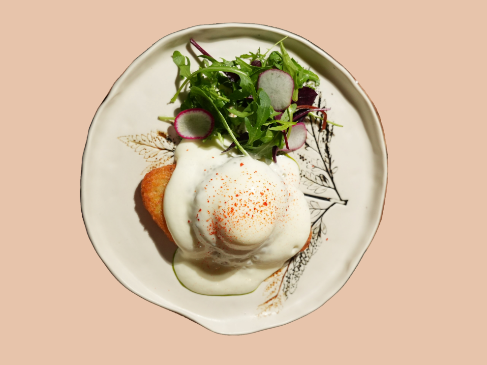 Картофельный хашбраун с бифштексом, яйцом пашот и соусом из пармезана