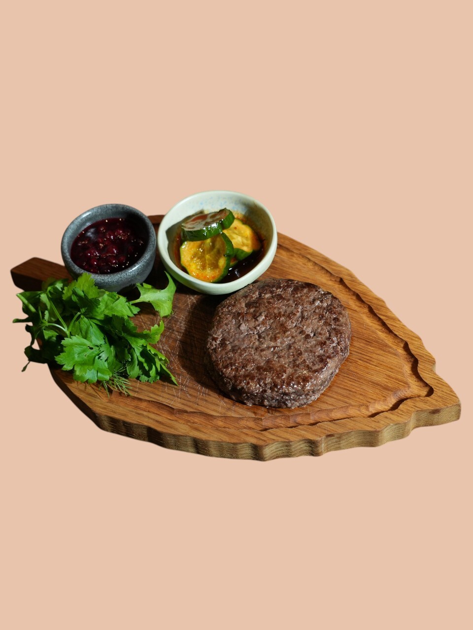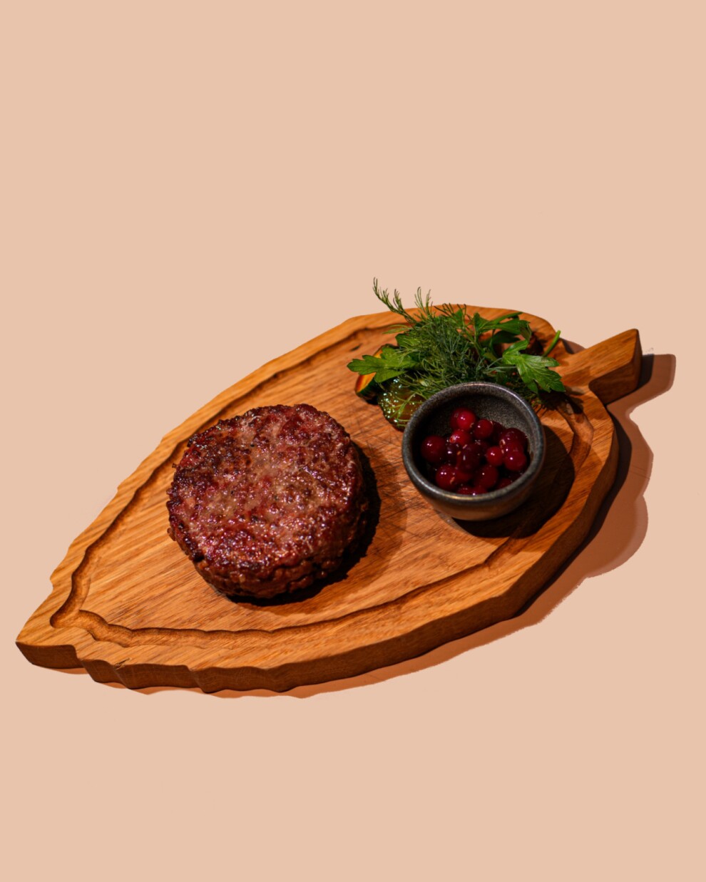 Сочный, нежный бифштекс из мяса молодого оленя, в сопровождении яркого брусничного соуса и хрустящих огурцов