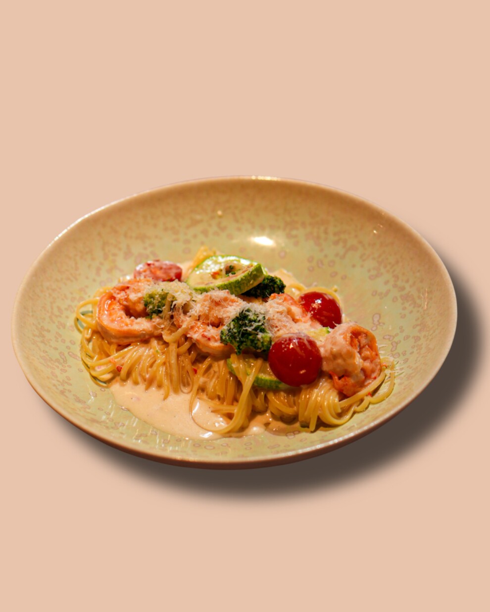 Мы взяли классические спагетти и добавили сливочный соус альфредо на основе куриного бульона, слегка подрумянили цукини и черри,что дало невероятную сочность блюду и дополнили хрустящими королевскими креветками.