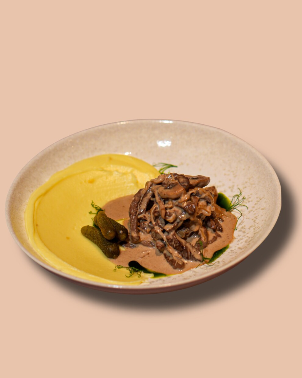 Нежное мясо оленя в бархатном сливочном соусе с грибами на подушке из воздушного картофельного пюре. Дополнили солеными огурцами. Это очень вкусно!