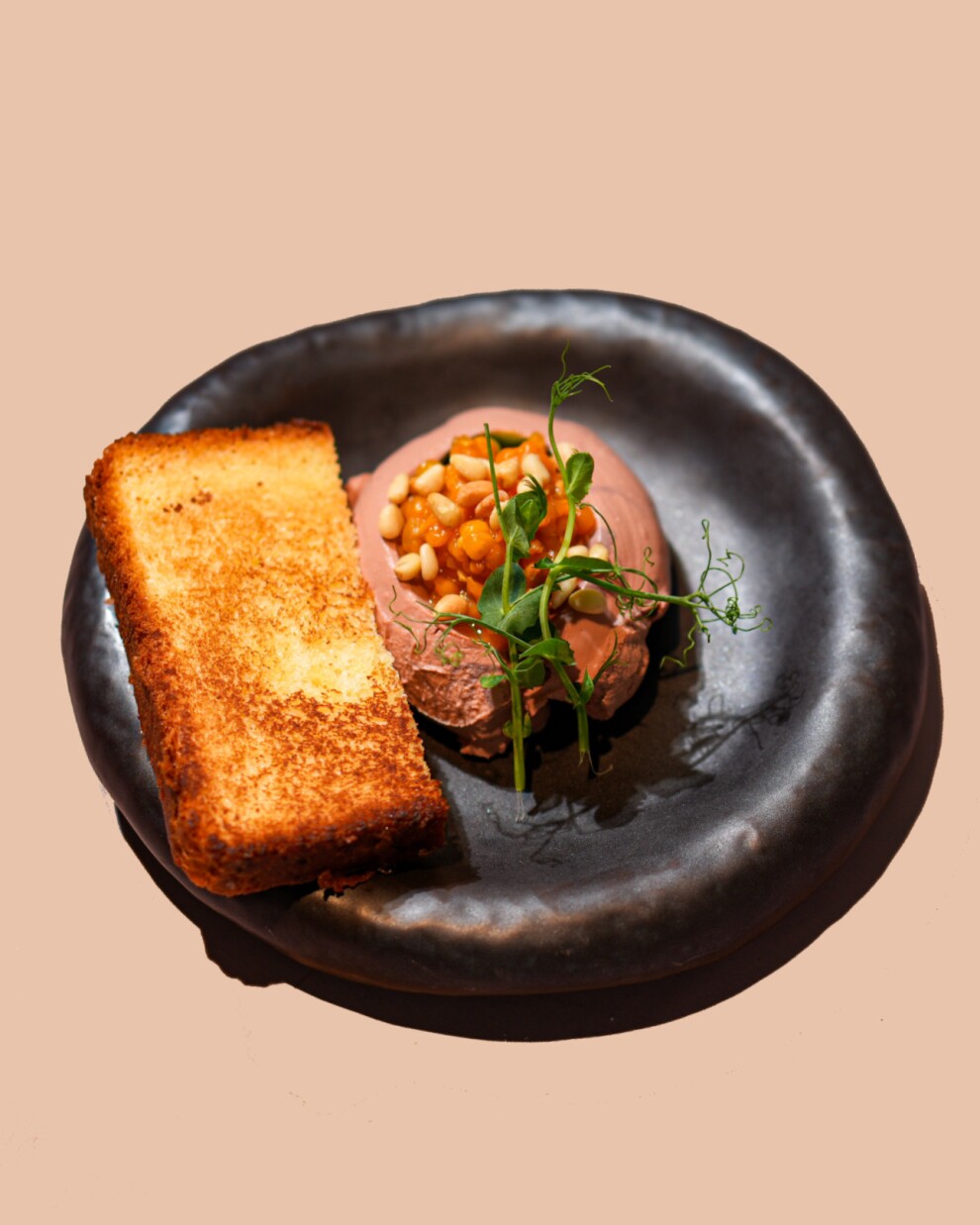 Деликатес с невероятно нежной текстурой и приятным сливочным вкусом. Добавили морошку в собственном соку, кедровый орех и слегка обжаренную до золотистой корочки бриошь, которую мы выпекаем сами.