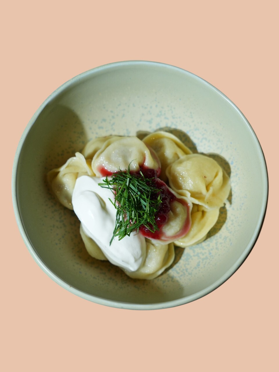 Пельмени ручной лепки, с сочным фаршем оленя, домашней сметаной и пикантной брусникой