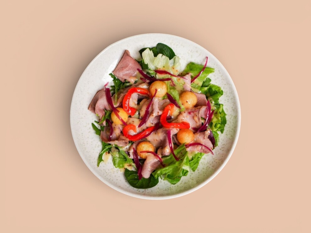 Потрясающий легкий салат, с нежным ростбифом из оленины, который мы делаем сами. Хрустящий, свежий микс зелени с медово-горчичным соусом.
