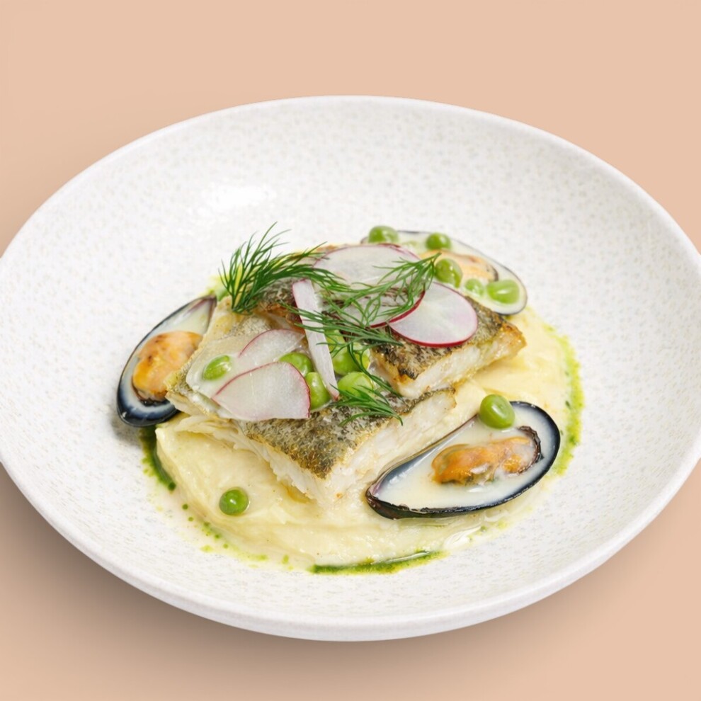 Нежнейшее филе трески с элегантной, хрустящей корочкой, дополнит воздушное пюре и сливочный соус