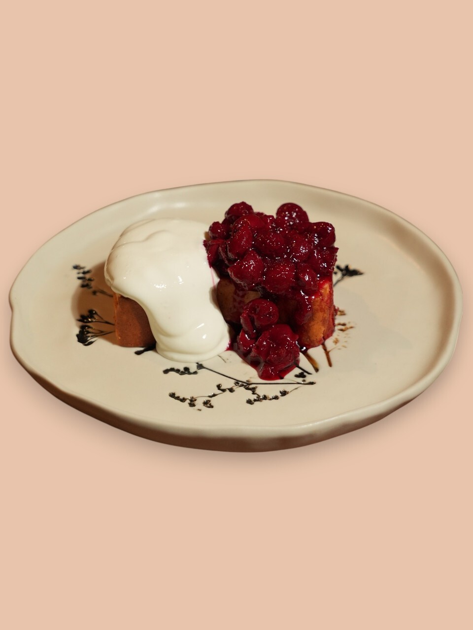 Творожная запеканка с вишнёвым соусом и сметаной