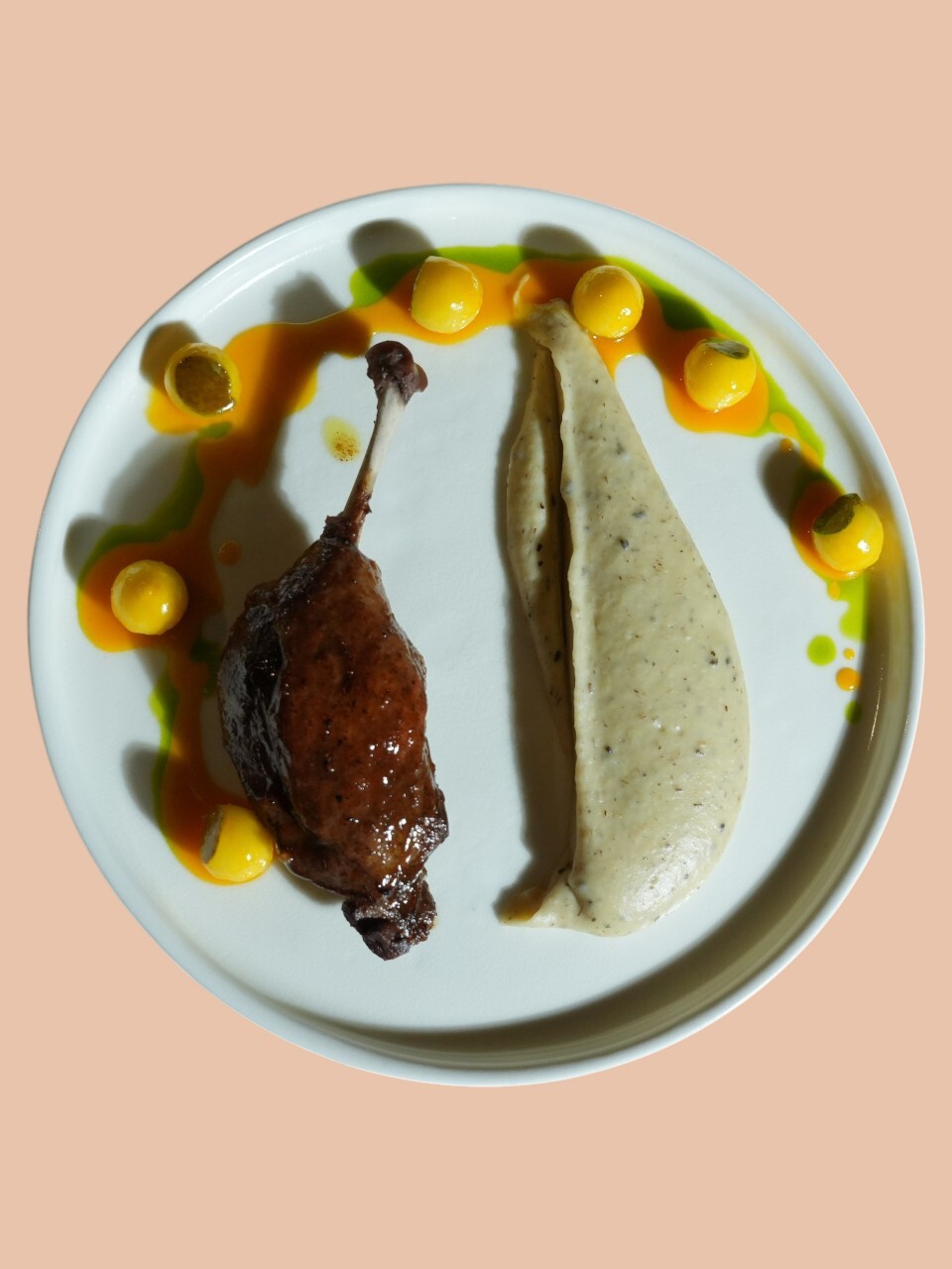 Томлёная утиная ножка с трюфельным картофельным пюре и грушей